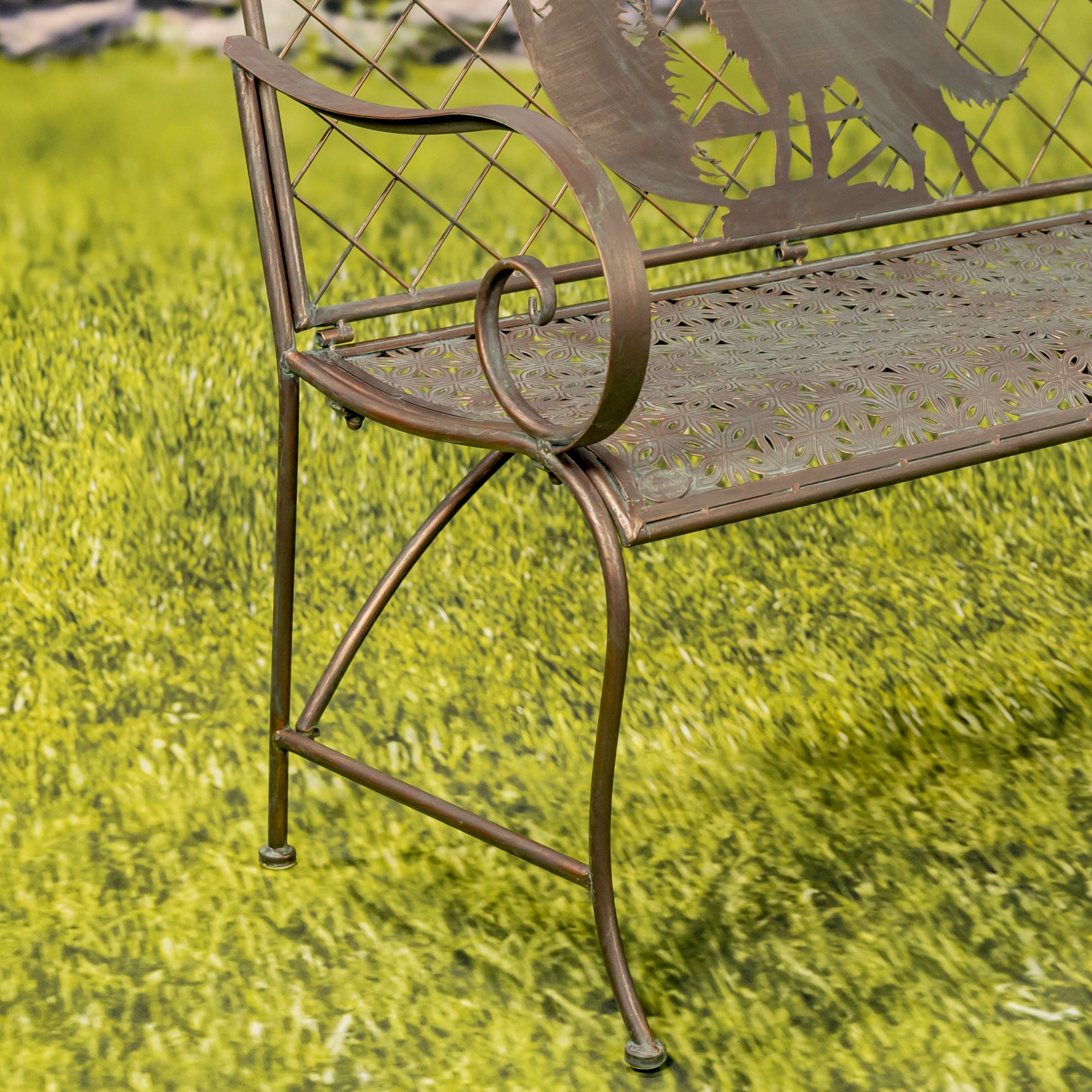 Our new collection of outdoor metal benches features a variety of North American landscapes and wildlife. Each high-quality, two-person bench is crafted from sturdy iron, hand-painted in a distressed Antique Bronze finish. The bench's design showcases a stunning silhouette of a wolf howling at a full moon, inspired by the town of Gunnison, Colorado's wolf reintroduction initiative. With a comfortable curved seat, elegant accents, and a lattice design, this timeless piece is suitable for both indoor and outdoor use, powder-coated for added protection. The distressed finish adds a unique touch to each bench, and the backrest features engraved textures. With its sturdy construction, partial assembly is required (hardware attached, instructions included). More specifications and images will be available soon. Dimensions: 43.7" L x 20.47" W x 41" H.