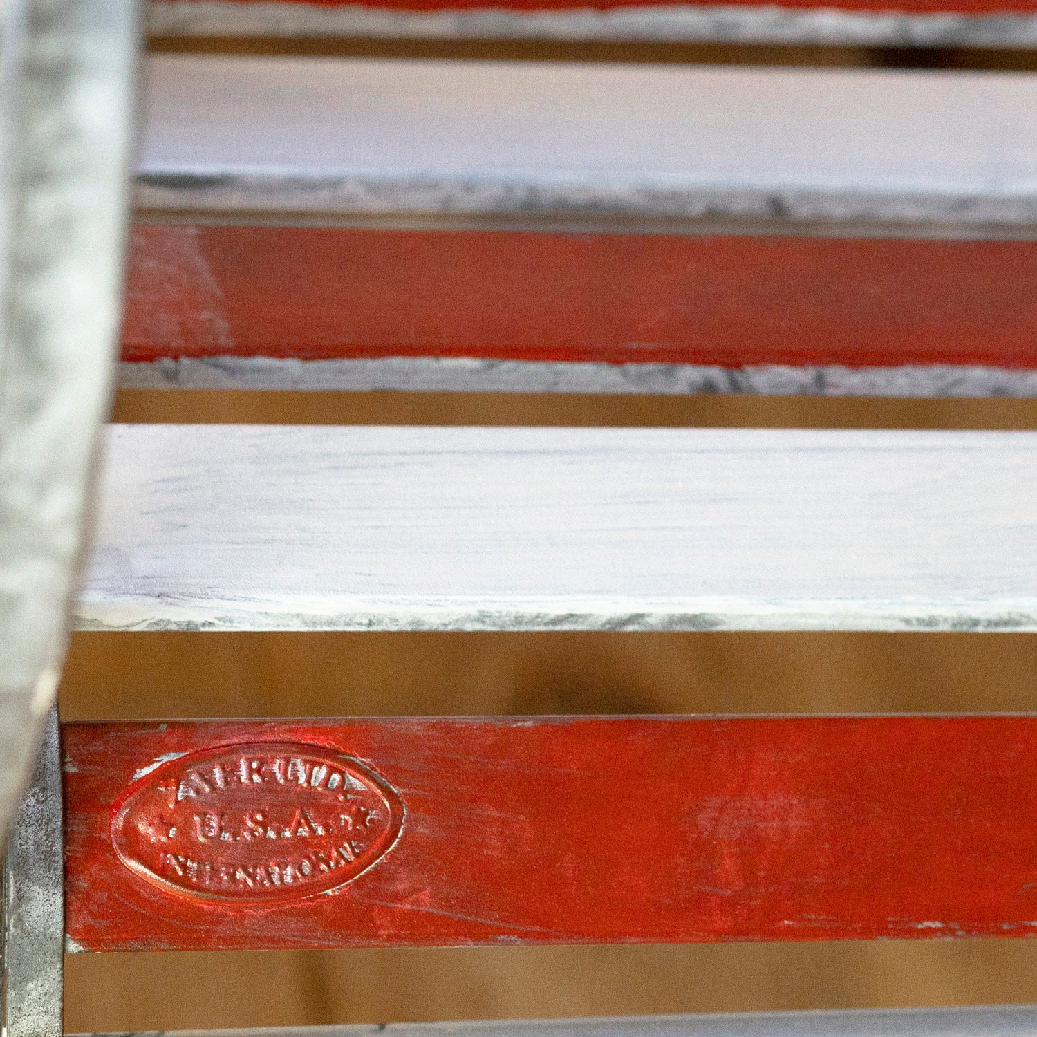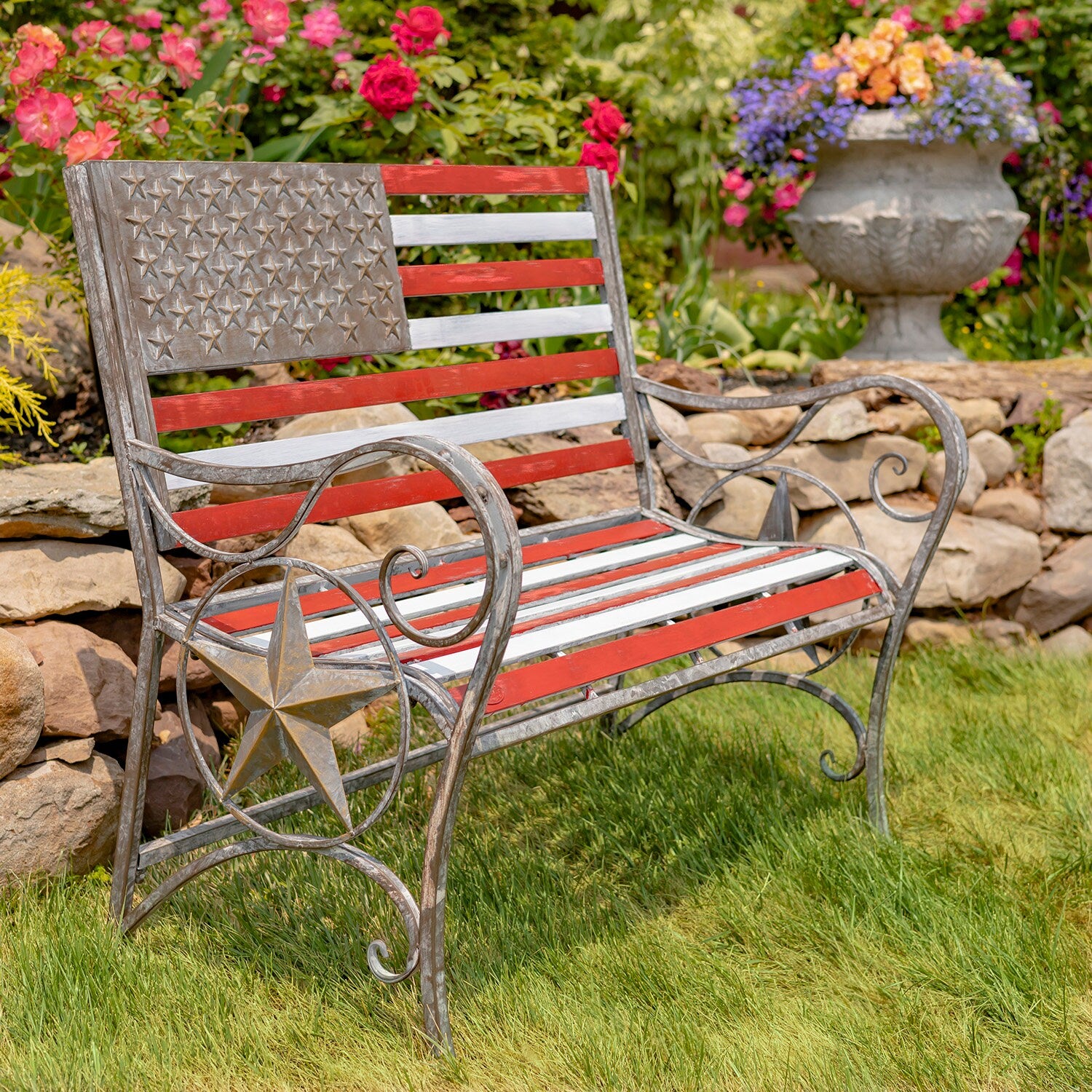 Experience time-tested durability with our Traditional Rustic Americana-inspired iron bench. The ideal addition to any American or country style home, this bench is crafted from 100% quality powder coated iron for both functionality and style. It is perfect for indoor or outdoor use, with weather and rust resistant features. The hand-painted design in classic Red, White, and Blue, along with a distressed finish for an antique look, adds a timeless charm. Assembly is easy with no tools required. Specifications include seating for 2 people, a weight capacity of 500lbs, a seat width of 42.5", a seat depth of 19", leg space of 14", and a backrest height of 19". With dimensions of 45.28" L x 20.47" W x 37" H, this iron bench is both sturdy and stylish.