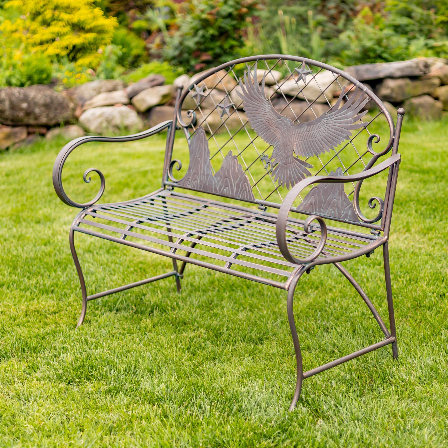 Our new line of outdoor metal benches features breathtaking North American scenery and wildlife. Each bench, crafted from high-quality iron, is expertly hand-painted in a rustic Antique Bronze finish. The "Klamath" bench is named after Oregon's Klamath Basin, known for its impressive concentration of bald eagles. A stunning American Bald Eagle is showcased on the backrest of the "Klamath" bench, surrounded by a lattice frame adorned with mountains and stars. This bench not only brings a piece of the magnificent outdoors into your home, but it also serves as a sturdy and durable seating option for two. Suitable for both indoor and outdoor use, this bench is powder coated for added protection and boasts a distressed, hand-painted finish. Assembly is required, but the included hardware and instructions make it an easy process. Dimensions: 43.7" L x 20.47" W x 37.4" H; Materials: 100% iron; Finish: Antique Bronze