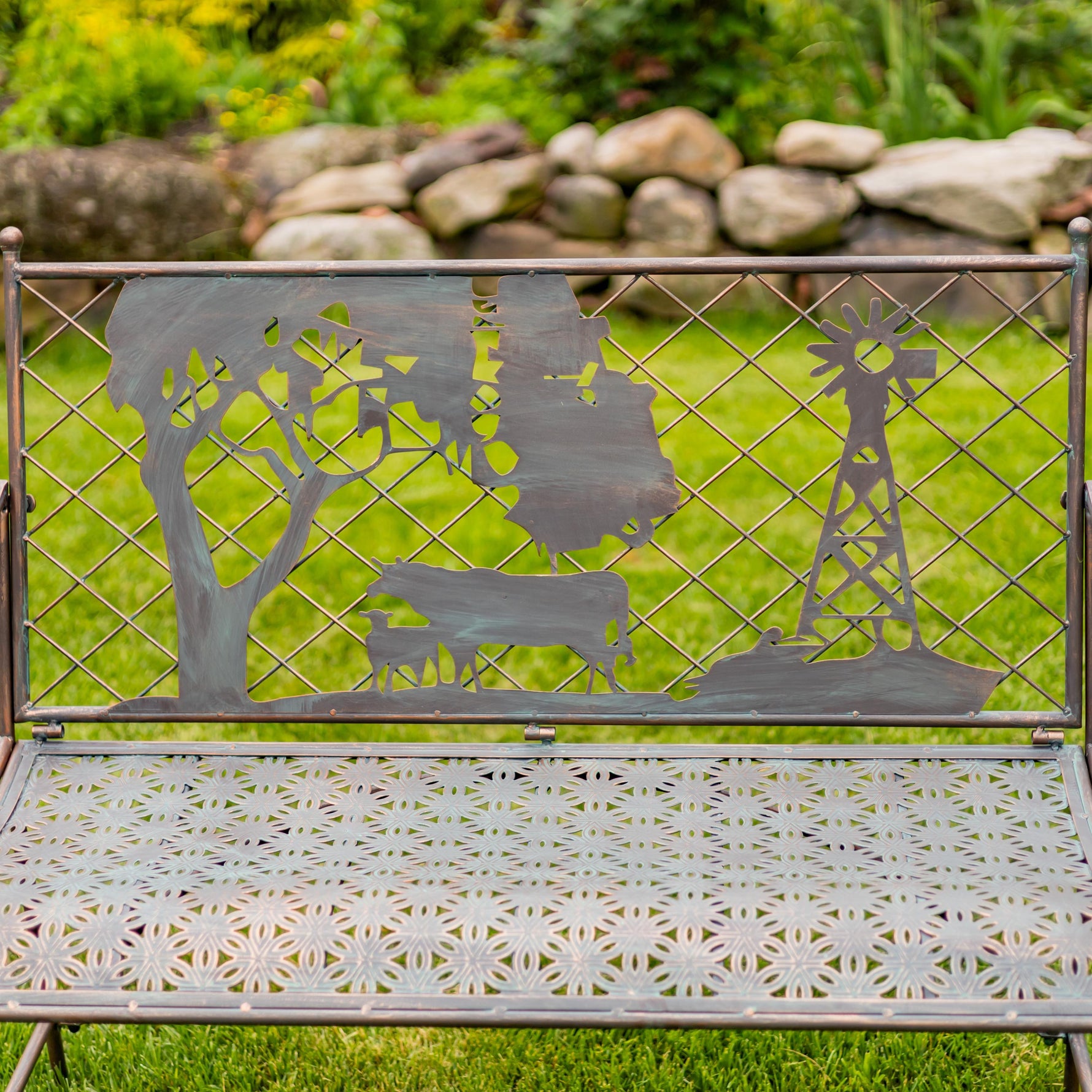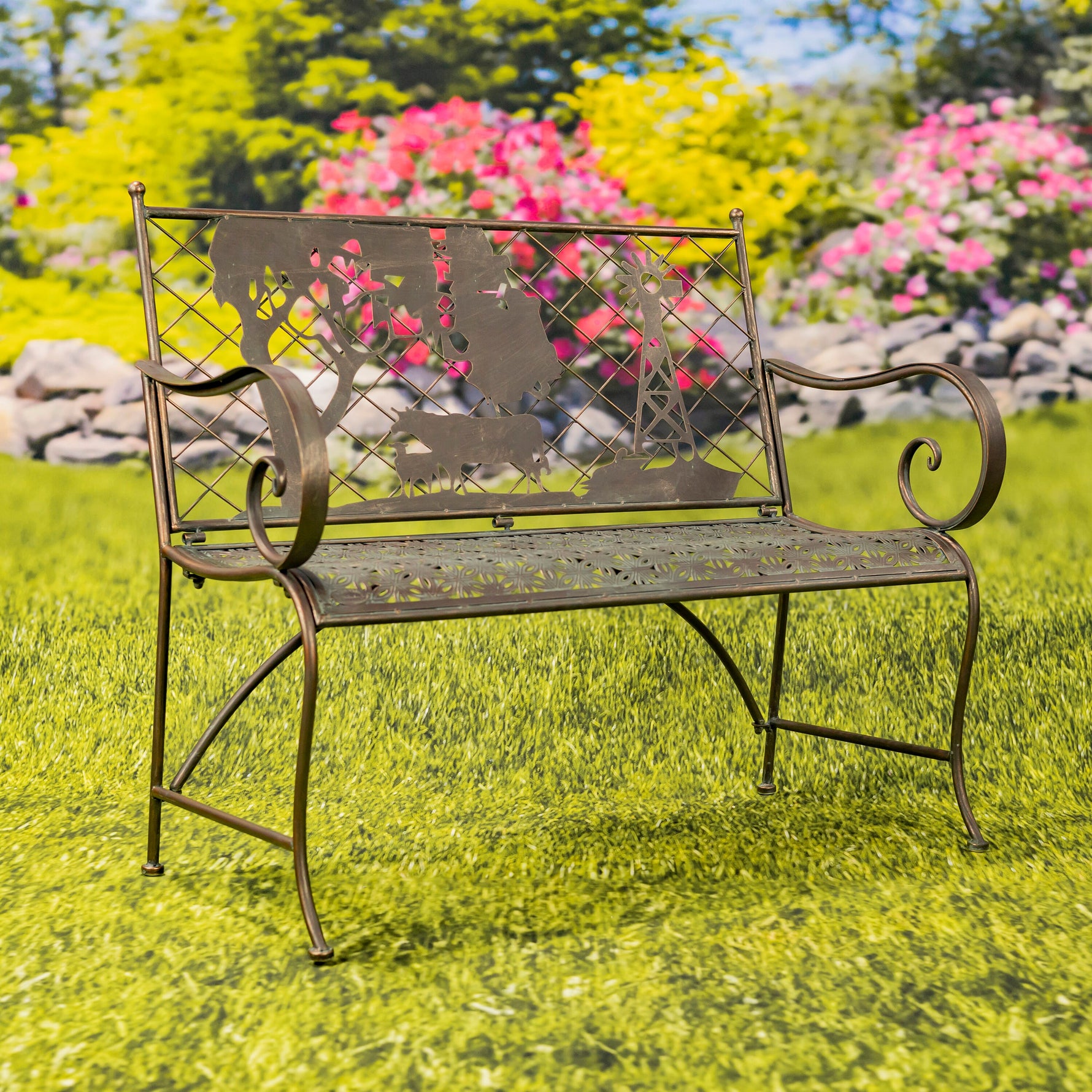 "Strasburg" Iron Garden Bench with Cow and Windmill Silhouette