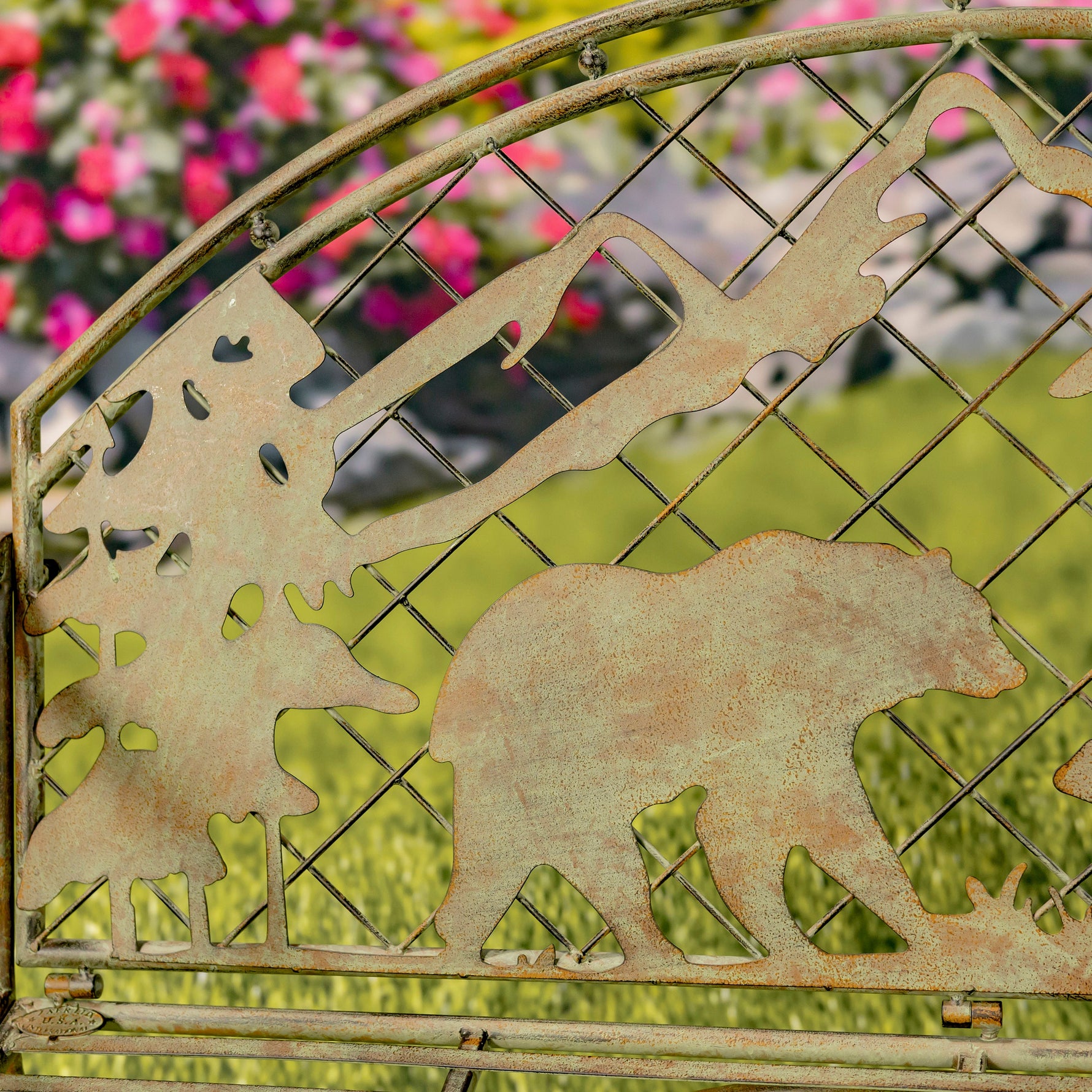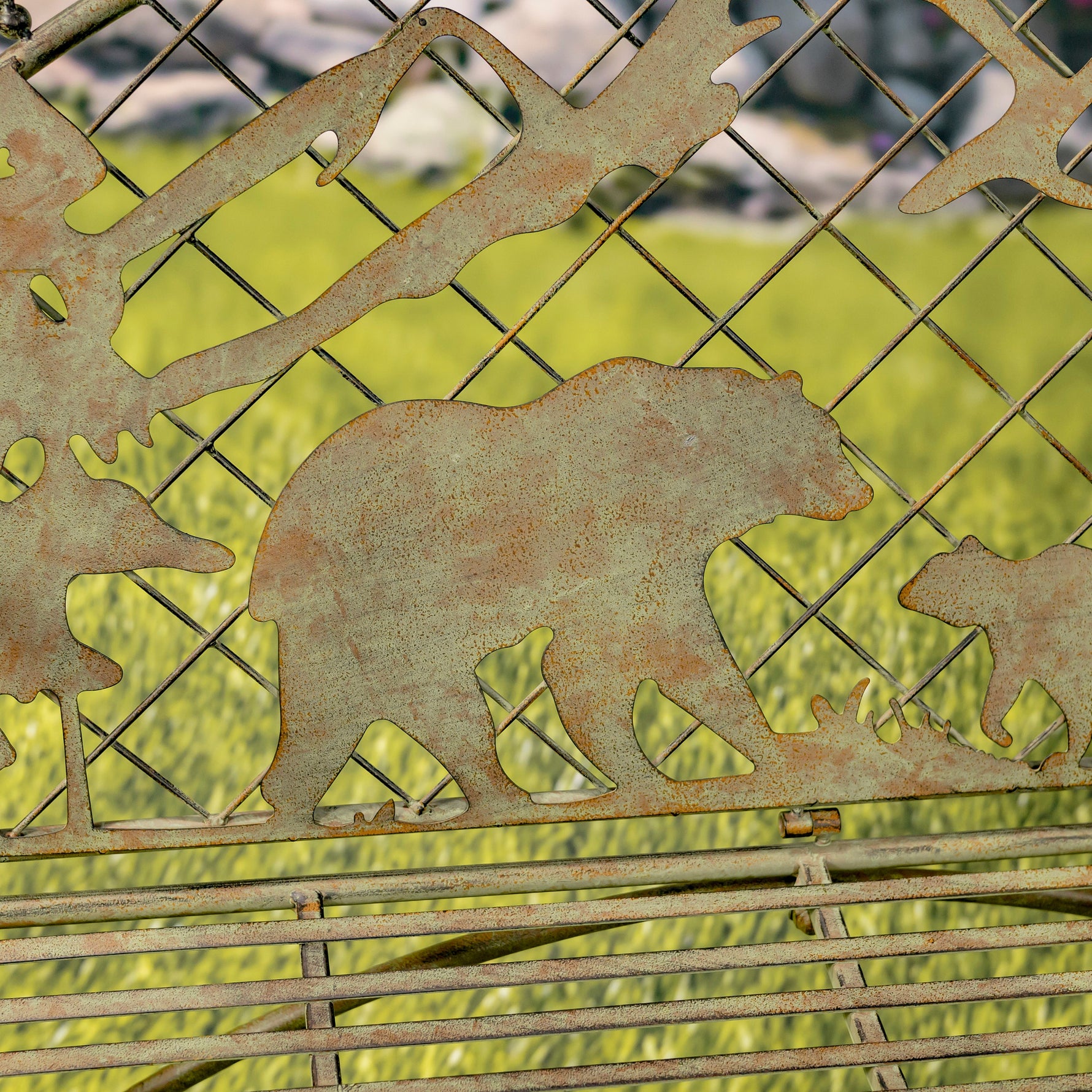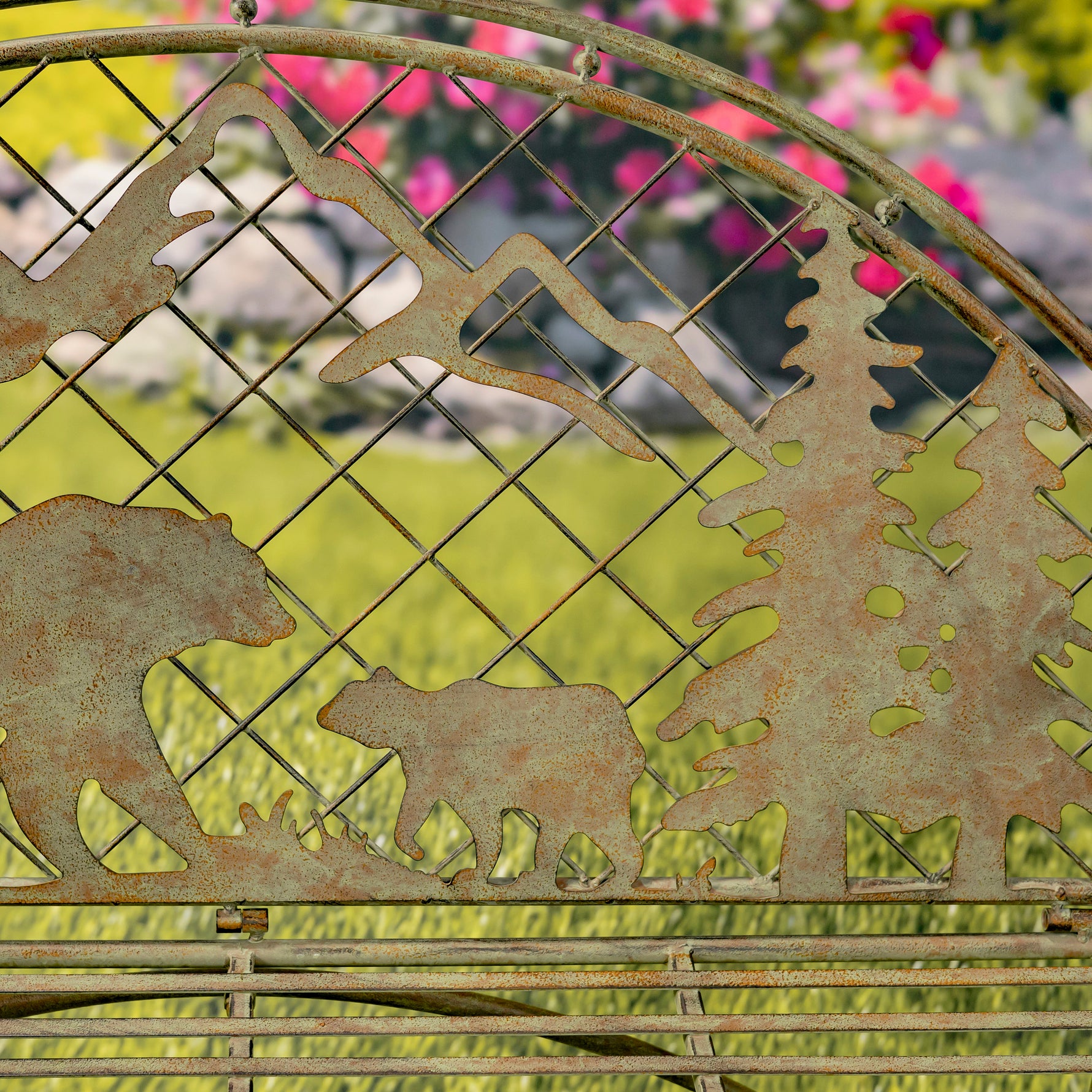 Experience the beauty of nature with our "Yellowstone" Round Top Iron Garden Bench, featuring a stunning double border lattice design showcasing a Mama and Baby Grizzly Bear and pine trees against a mountain silhouette background. Crafted from high-quality iron, this two-person bench has a durable and sturdy construction, with a powder coated finish for added protection. Each piece is hand painted in a distressed Reddish-Green color, adding a unique touch to every bench. Assembly is required, with included instructions and attached hardware. With a seat width of 40.5" and a backrest height of 22", this bench is perfect for both indoor and outdoor use. So sit back, relax, and enjoy the natural beauty of the great outdoors with our "Yellowstone" bench.