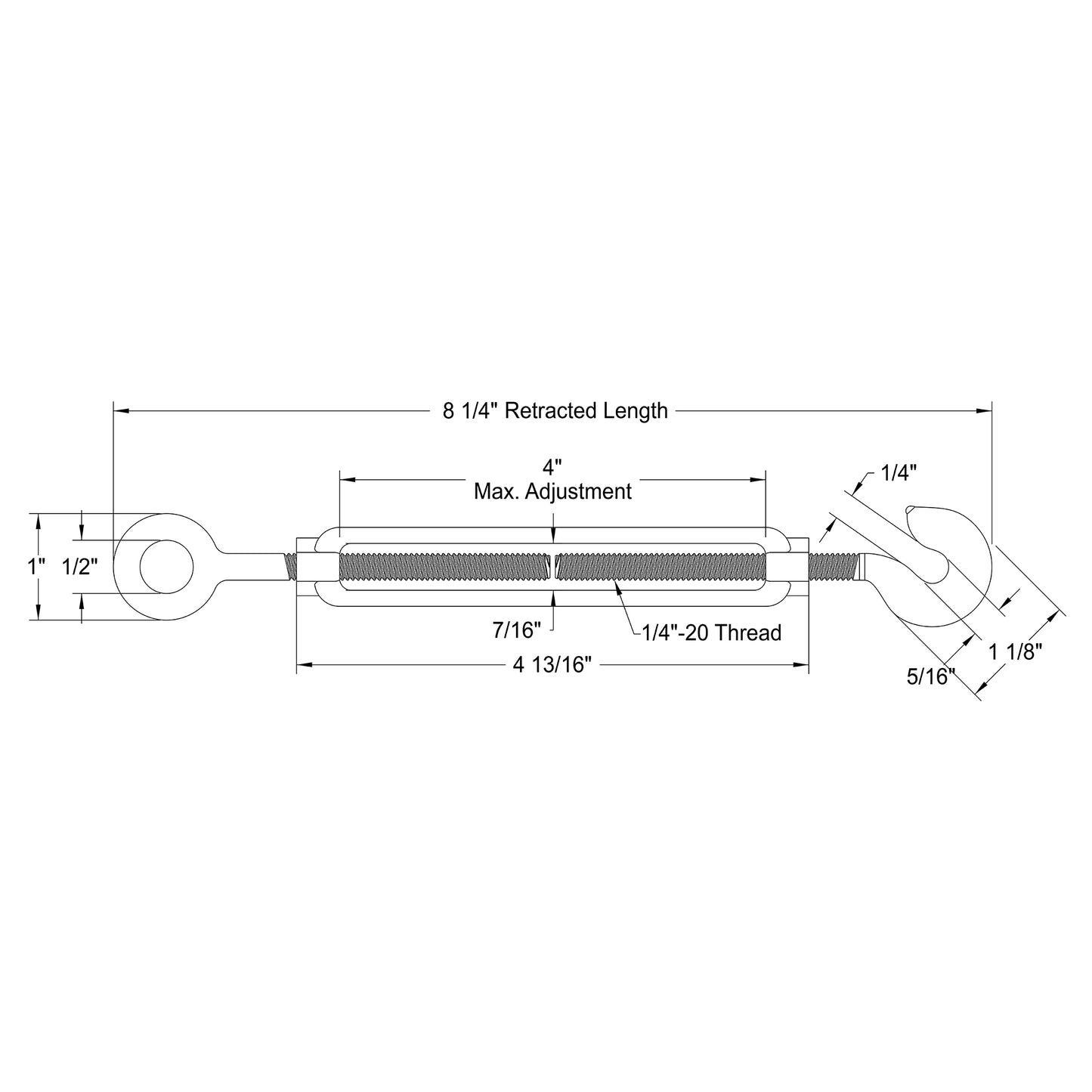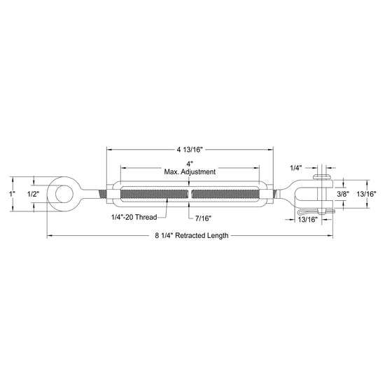 4 13/16" long, 4" maximum adjustment, 500 lb weight capacity, threaded for 1/4"-20, made of forged steel