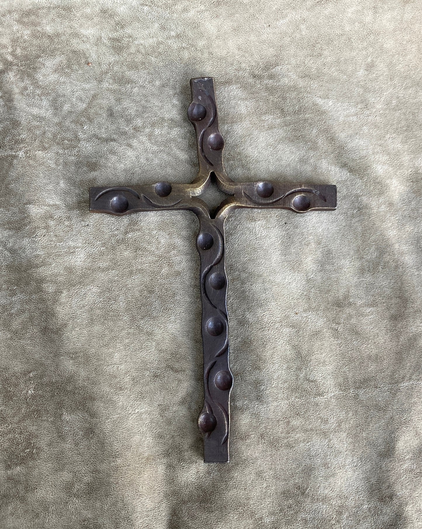 Each of these beautiful crosses is hand forged by Artisan blacksmiths. Once forged, they are embellished with our custom tooling, embossed with brass highlights, and given a traditional wax finish. This unique cross measures roughly 8 inches high and 5 inches wide. This listing is for ONE cross. You will receive one cross.