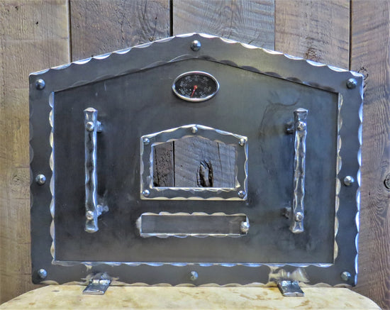 Custom iron freestanding pizza oven door with a jack arch. There are options of insulation, window, damper, thermometer, wood or metal handles, and texture.