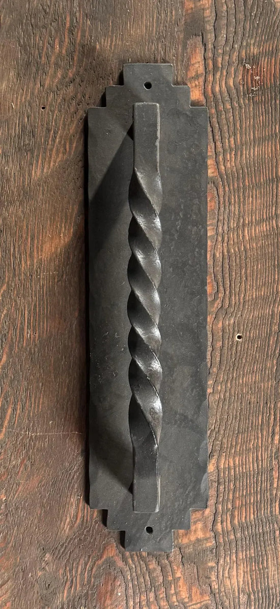 Door pulls come in matte black, natural iron, oil-rubbed bronze, and hand-distressed finishes. Hammered, peened, and antique textures are applied in-house to coordinate with our hinges, straps, and other rustic iron hardware.