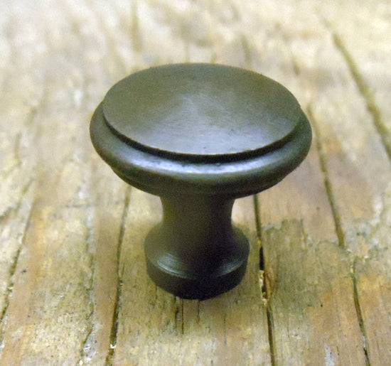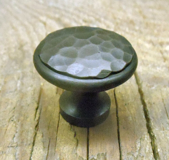 Cabinet knobs come in matte black, natural iron, oil-rubbed bronze, and hand-distressed finishes. Hammered, peened, and antique textures are applied in-house to coordinate seamlessly with our handles, hinges, and decorative hardware.