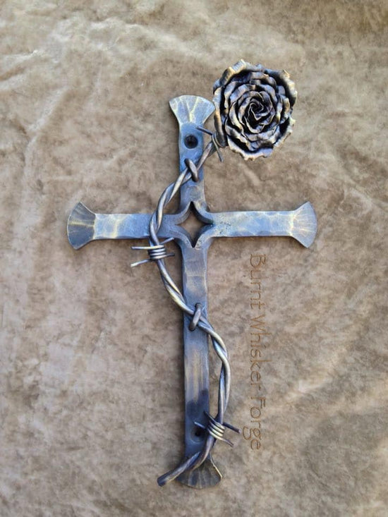 This beautiful hand forged iron rose and crucifix is a one of a kind creation. This barbwire cross and rose measures 15 inches and by 10 inches. and the rose sticks out 4 inches from the wall.