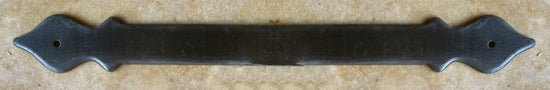 Straight straps come in matte black, natural iron, oil-rubbed bronze, and several hand-distressed rustic finishes. Hammered, peened, and antique textures are applied in-house to coordinate with our hinges, bolts, and architectural hardware.