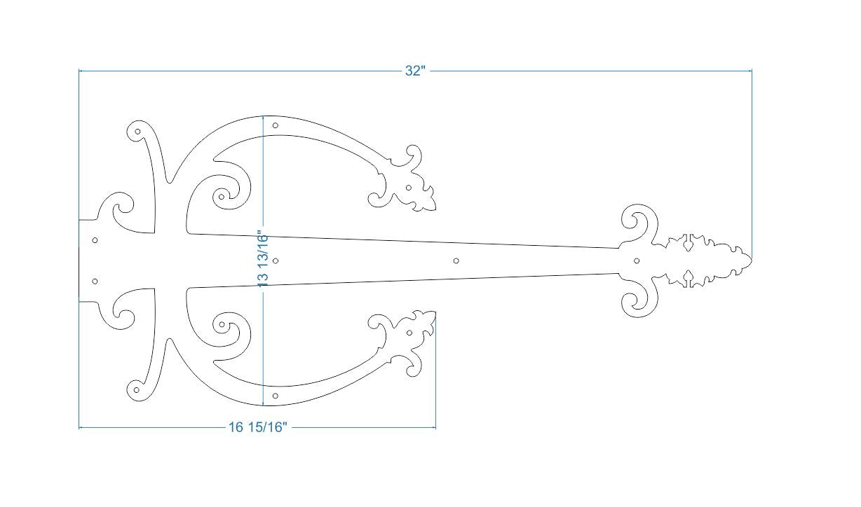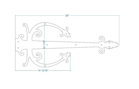 Medieval iron hinge strap has a spear shaped end detail on a moderately thin, slightly tapered strap. This strap is compatible with the more ornate styles such as Celtic, Gothic, Viking, Baroque, Medieval, Renaissance, Neo-Classical, and Spanish styles.