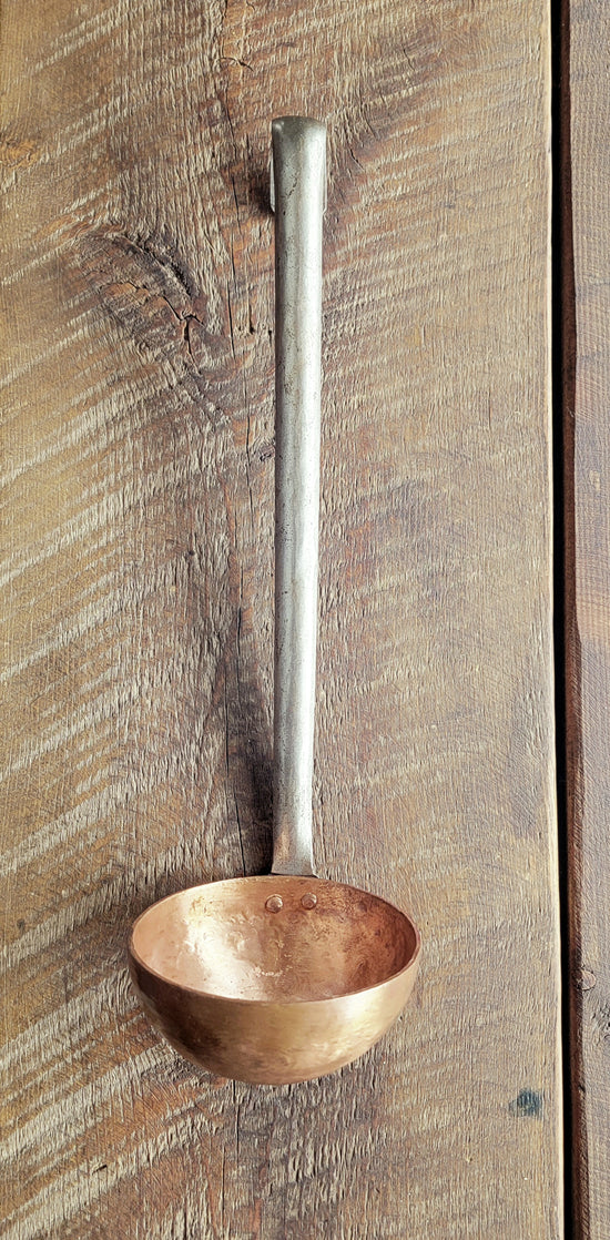 Louche en cuivre pur, martelée, tasse de 3,75" de diamètre, manche de 8" de long. 10" de longueur totale.