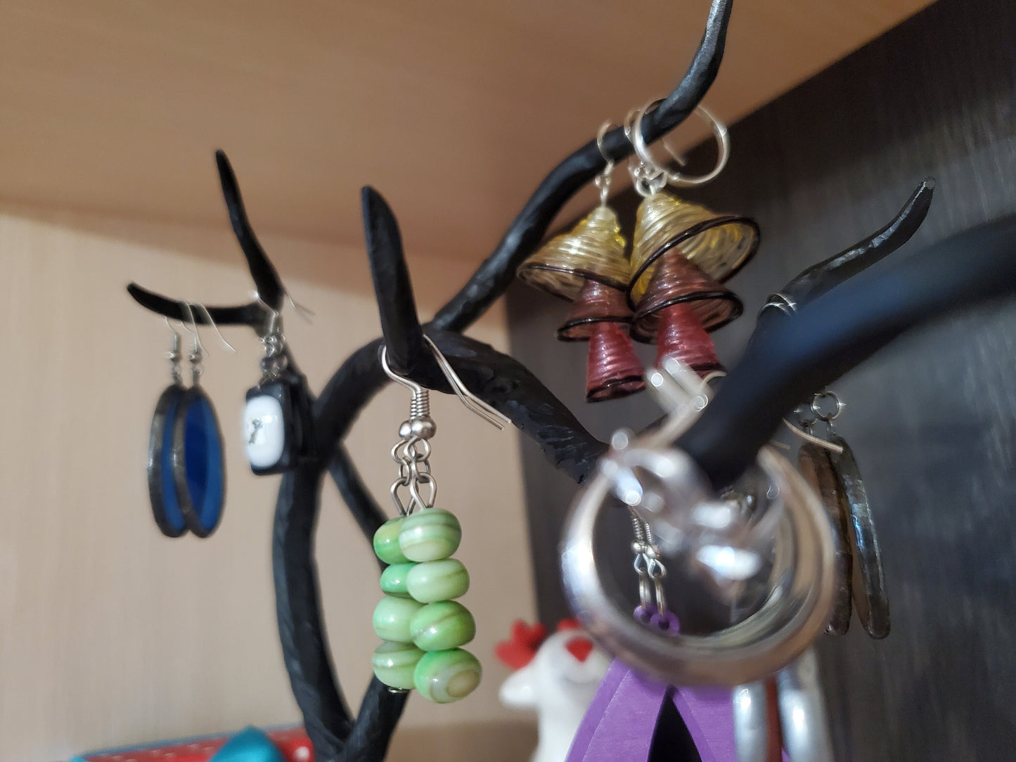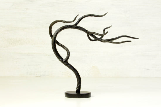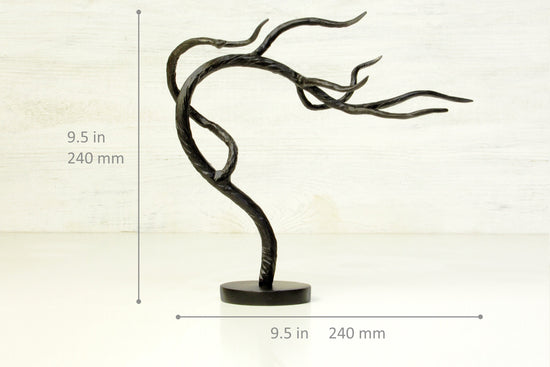 This jewelry holder provides both comfort and beauty in storing various pieces such as earrings, pendants, and bracelets. It adds a unique touch to your home decor by combining handmade wrought metal with your personal jewelry collection. It also makes a practical and aesthetically pleasing gift. The organizer's dimensions are approximately 9.5 inches in height, 9.5 inches in length, and 4 inches in width, making it a functional and stylish addition to any space.