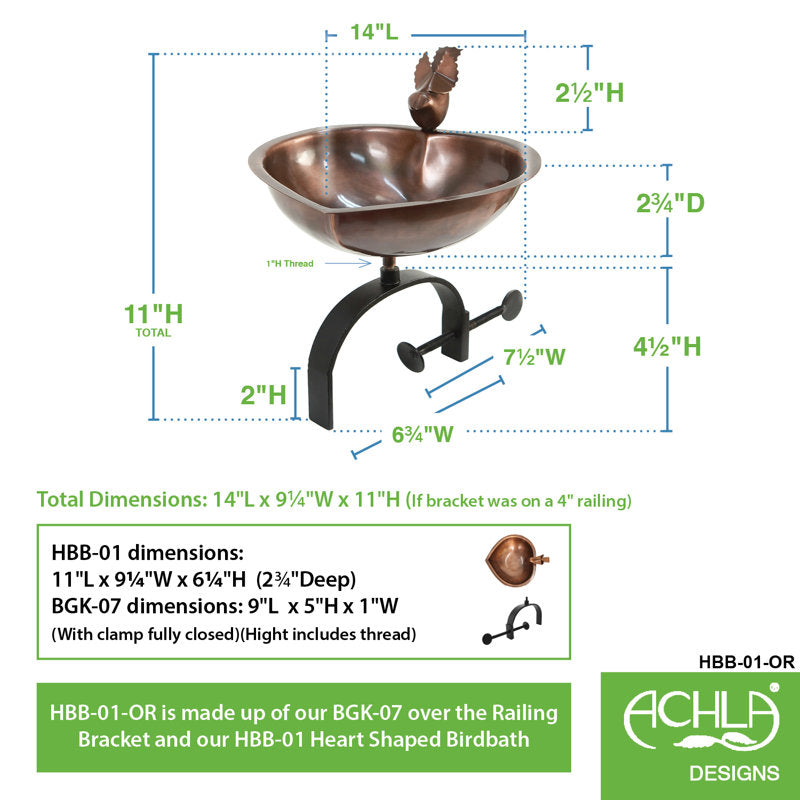 Constructed with a simple bird detail, this charming copper birdbath is designed to effortlessly fit onto handrails of porches, balconies, or decks using its threaded base and accompanying wrought iron bracket. With its convenient C-type clamp, this bracket securely holds the birdbath in place without the need for tools or permanent attachment. Truly a wonderful gift for those who adore birds or enjoy gardening, it also makes for a thoughtful copper anniversary present.