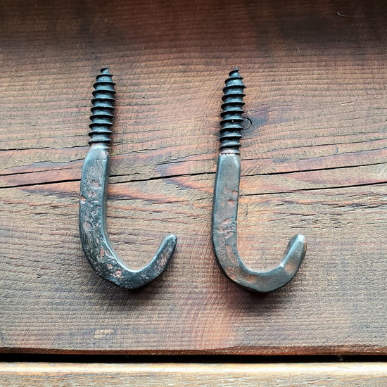 Hooks come in matte black, natural iron, oil-rubbed bronze, and multiple hand-distressed finishes. Hammered, peened, and antique textures are applied in-house to coordinate with our hinges, pulls, and rustic hardware.