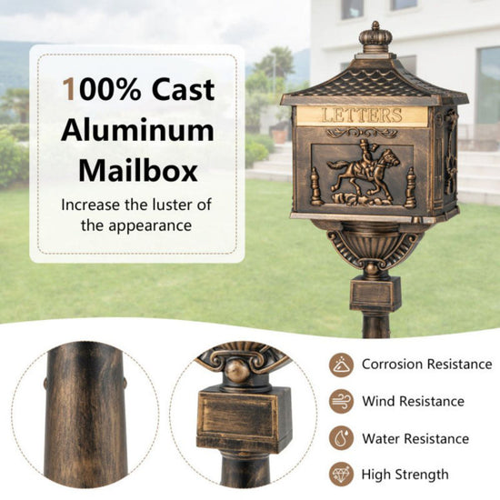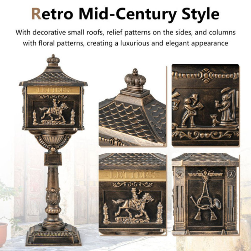 This Retro Mailbox blends functionality with vintage style, featuring detailed reliefs and a distinctive scale-patterned roof that adds historic charm to any outdoor setting. Measuring 14" x 11.5" x 46", it offers ample space for mail while you’re away. Crafted from heavy-duty cast aluminum, it resists weather and rust for lasting use. Security is enhanced with a lockable door, two keys, and a baffle door. Installation is straightforward thanks to pre-drilled holes and included expansion bolts. Ideal for homes, banks, or businesses, it combines practicality with classic design.