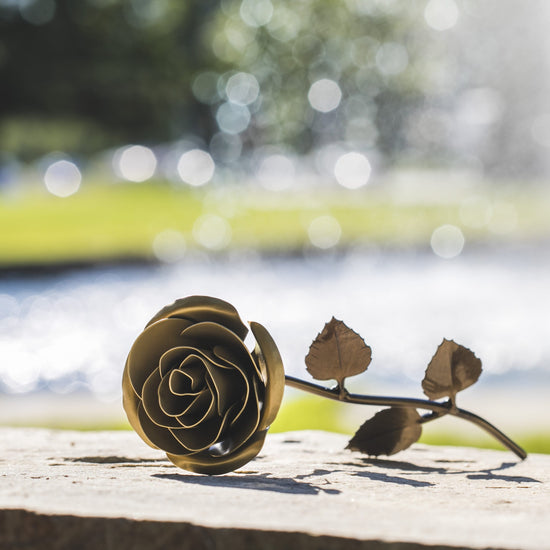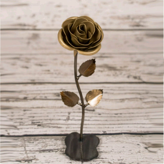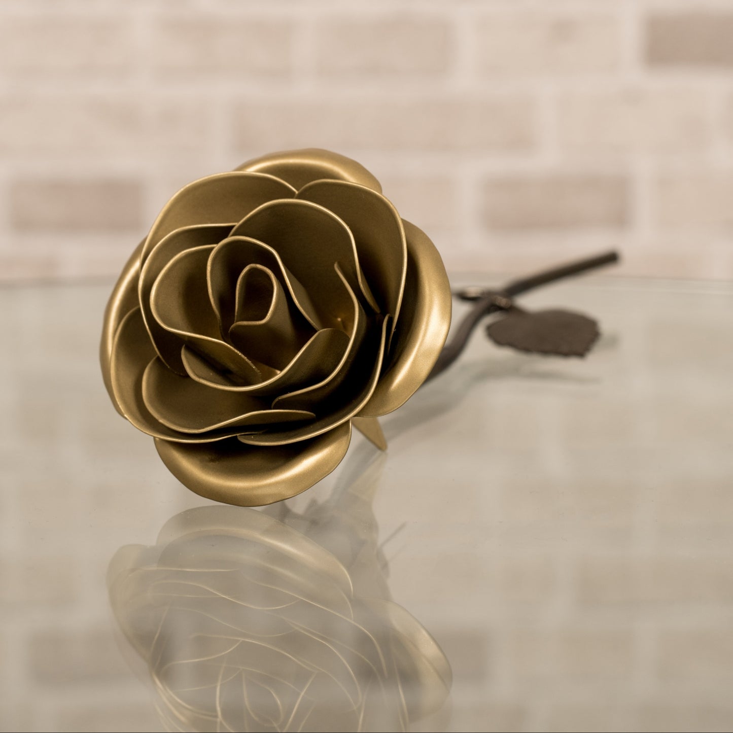 Celebrate your 50th anniversary in style with our handcrafted gold rose. The perfect gift for any couple or parent, this elegant rose is a symbol of love and longevity. Embodying the sentiment of "fifty is golden," this exquisite rose is expertly handcrafted in our traditional forge, ensuring both durability and beauty. Add a personal touch by customizing with a name or special date. Shipping within the US and Canada takes approximately 4 to 8 business days, while international orders can take up to 2-4 weeks for delivery. Please note that all customs and import fees are the responsibility of the buyer.