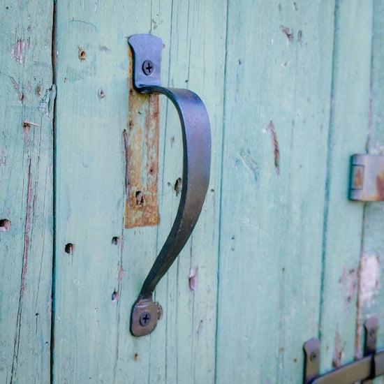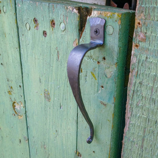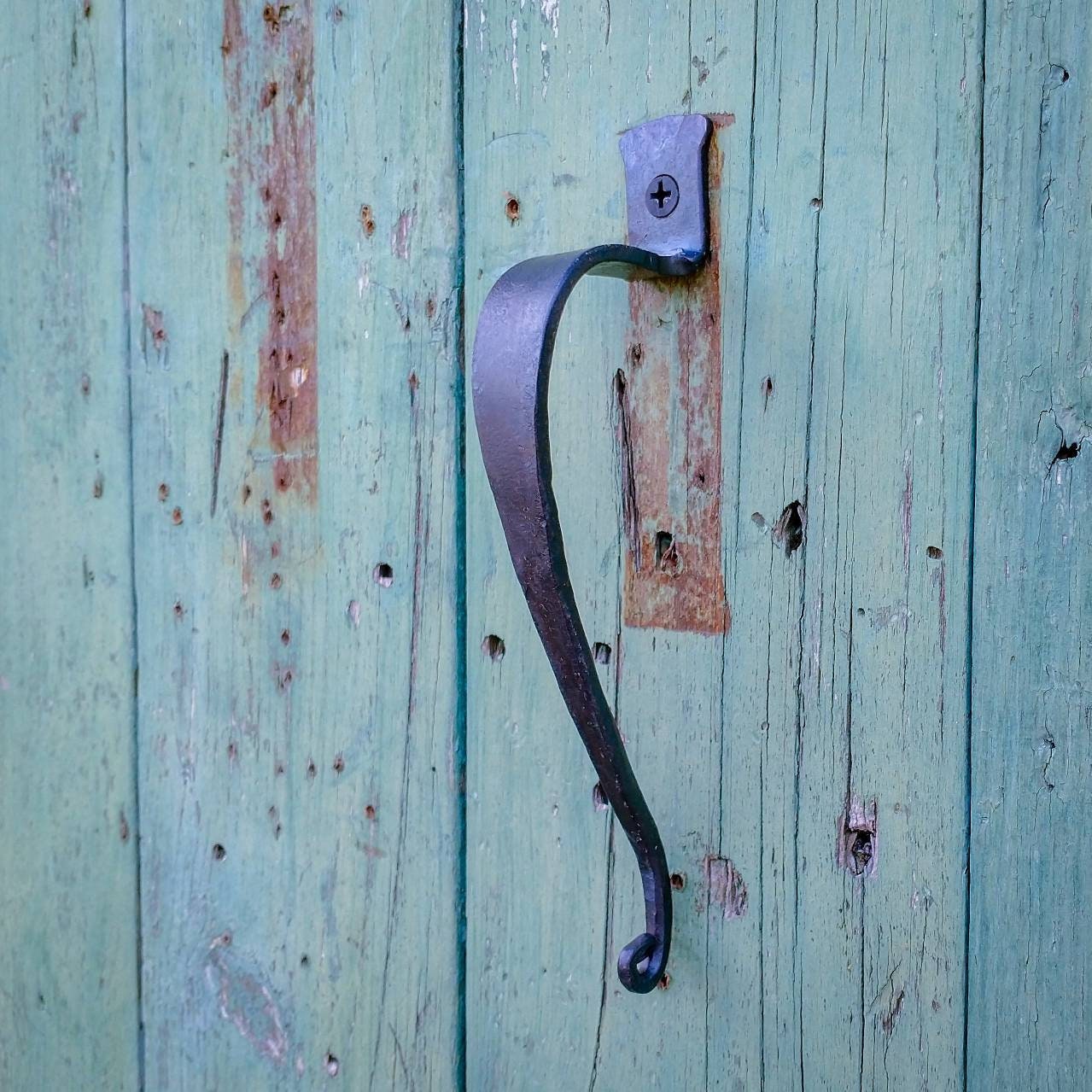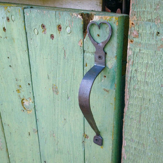 This classic blacksmith door handle combines robust construction with a simple rustic aesthetic, suitable for both barn doors and interior doors. Choose between a straightforward fantail design or a more refined heart shape, available with either a single top mounting featuring a decorative finial or a sturdier dual mounting at both top and bottom. Crafted from heavy-duty steel, these hand-forged pulls come in various sizes and styles, with customizations available upon request. Each piece is made to order, typically requiring 1 to 2 weeks for shipping, though high demand may extend this to 2 to 4 weeks unless expedited. Made from low carbon steel, the handles may develop rust over time but can be protected with a beeswax matte finish for indoor or sheltered use, or a durable polyurethane coating for outdoor exposure. Finishes can be refreshed as needed. Please contact me with any customization requests or questions about finishes.