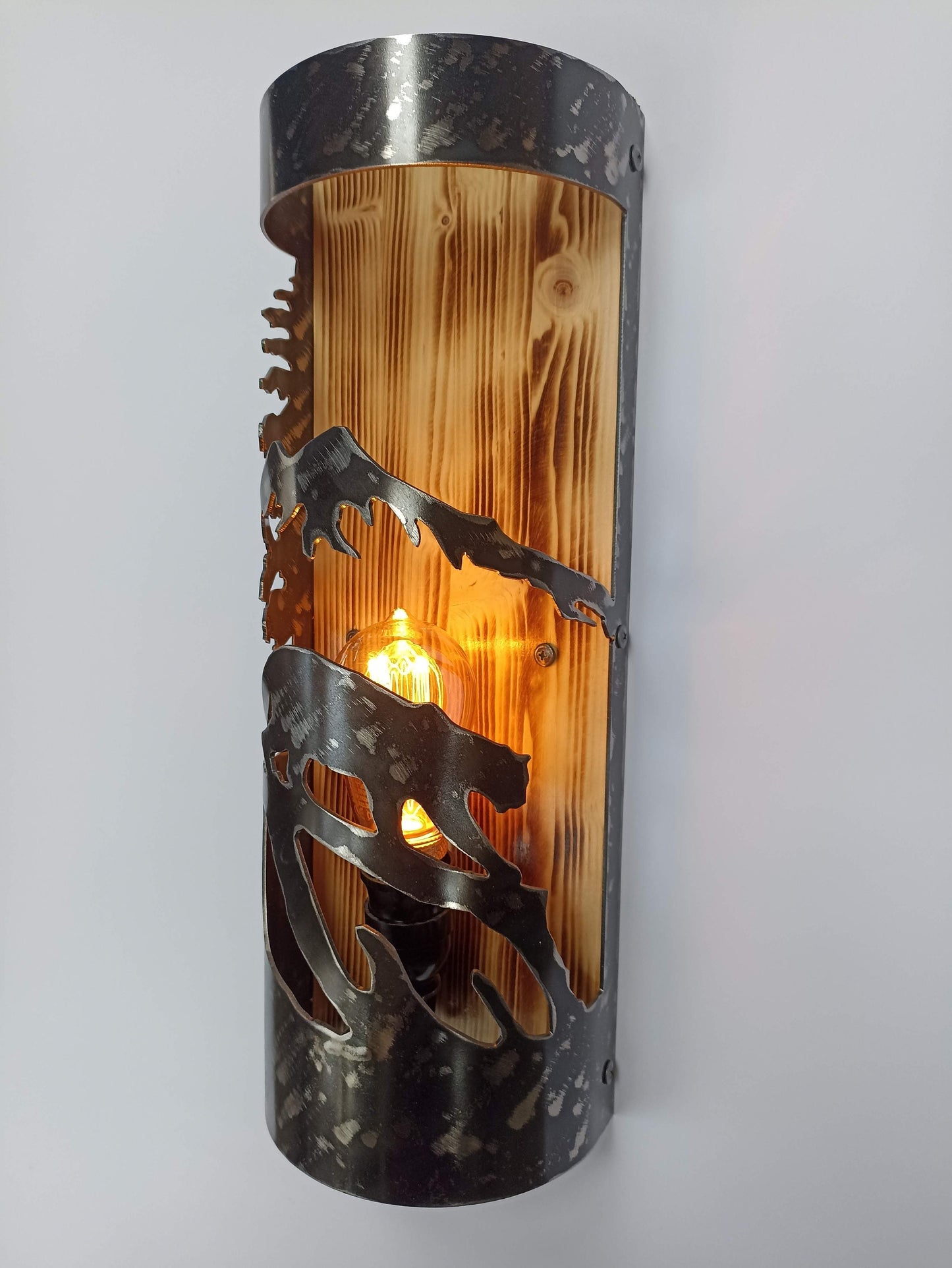 This wood and steel cabin sconce, part of the Mountain Lion collection, showcases a rustic design perfect for log houses and lodges. Each unique finish is handcrafted and can be personalized to fit your theme. Made in our workshop, this light features 14 gauge brushed hot-rolled steel and a variety of finishes including burned wood and clear coat. With dimensions of 17 inches in height, 6 inches in width, and 4 inches in depth, this light can be easily installed in any country and has e26/e27 bulb sockets. It is capable of operating at 110v~230v with a maximum wattage of 1x60 watts. Photos feature 4-watt Edison LED amber bulbs, but bulbs are not included. Processing and shipping typically takes 5-7 working days.