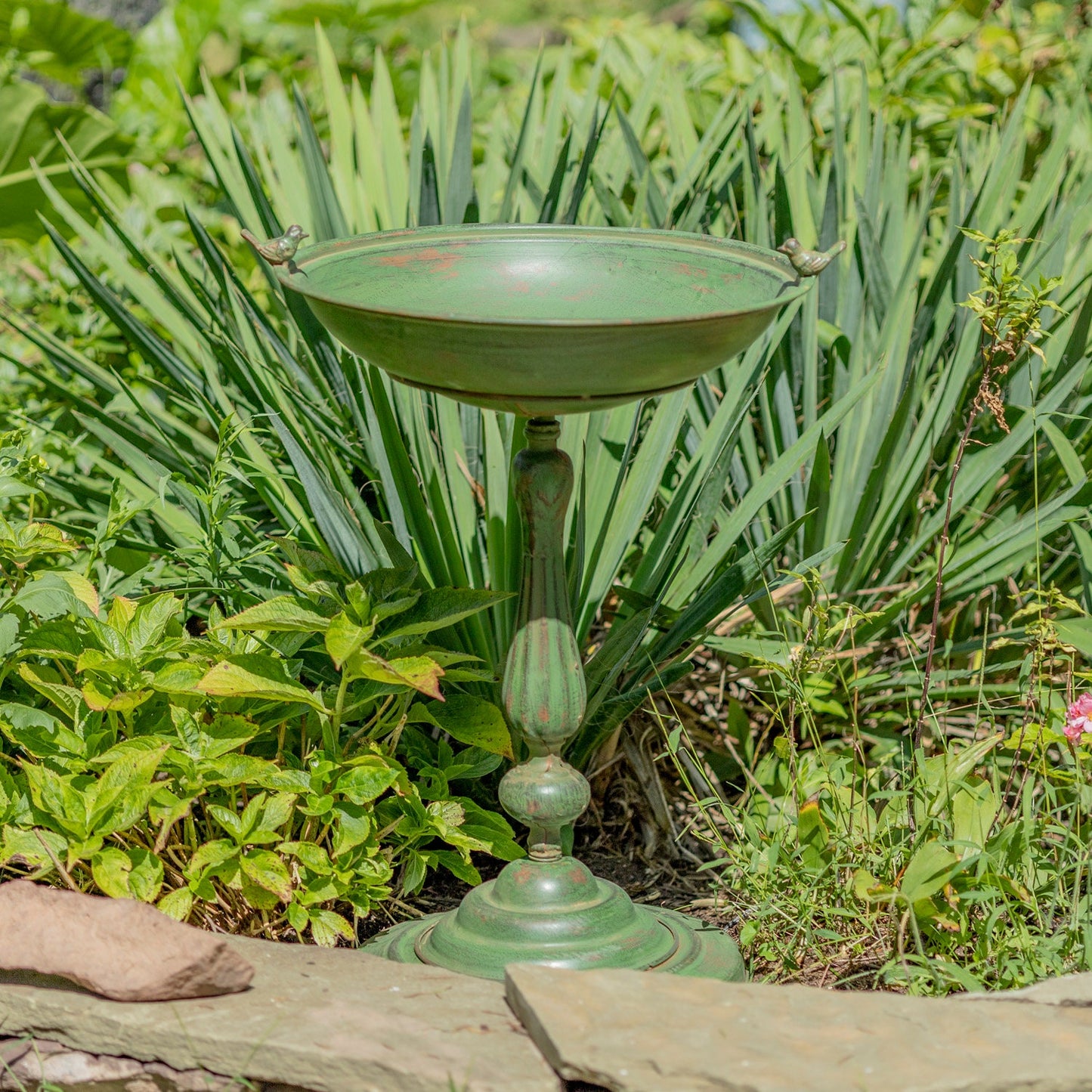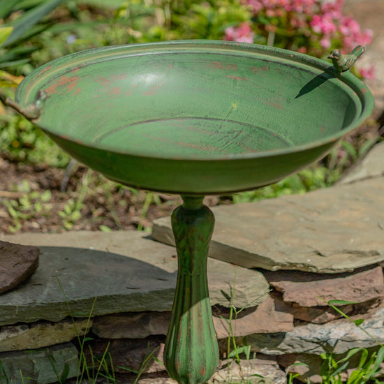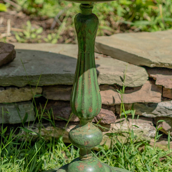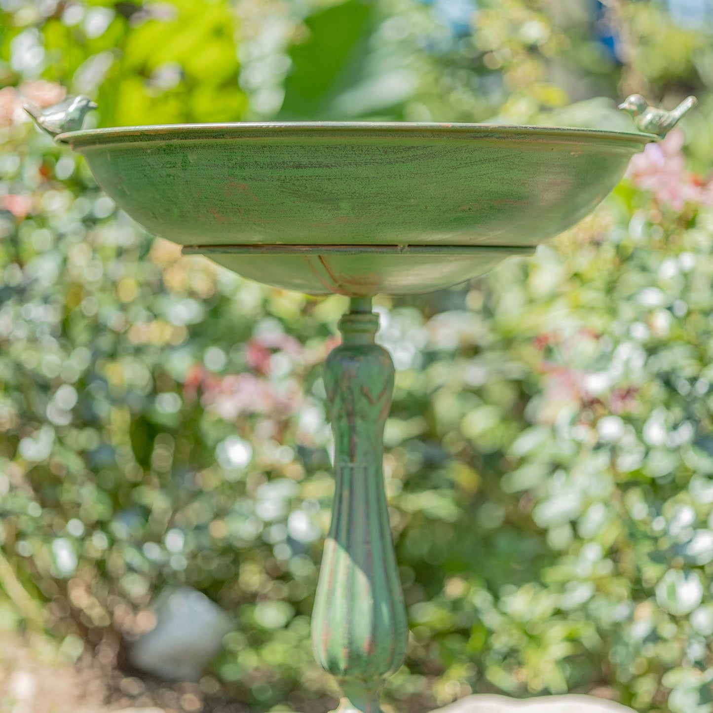 The Pedestal Birdbath has been enhanced to offer not only its traditional function, but also the versatility to be used as a bird feeder or plant stand. Constructed with durable powder coated metal, this piece of garden decor is suitable for both indoor and outdoor use and features intricate, distressed painted detailing. Measuring 22.5" L x 19.5" W x 28.75" H, this birdbath offers a 4 in. deep basin and a 19.25 in. diameter. Refer to the main image for a representation of its appearance.