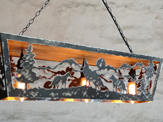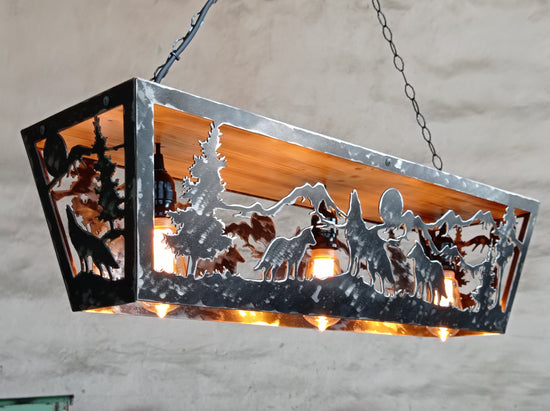 Constructed from durable 14-gauge (2mm) brushed hot-rolled sheet steel and burned wood, the Wolves Cabin light is a stunning addition to any lodge or log house. Steel and wood are both clear coated for maximum protection. The light comes with a ceiling mount and can be easily customized to fit any theme and size. Materials include steel and wood, while the dimenions can be adjusted with the accompanying chain, with a default maximum drop of 2 feet (60cm). For further customization, please leave a message. Fixture dimensions are 32 inches (81cm) in length, 9 inches (23cm) in width, and weighs 13 lbs (~6kg). Installation is a breeze, as the light can be wired for use in all countries and is equipped with e27/e26 bulb sockets. The ceiling canopy mount is also provided, and the light can be swag mounted or installed on sloped/vaulted ceilings. It can even be placed