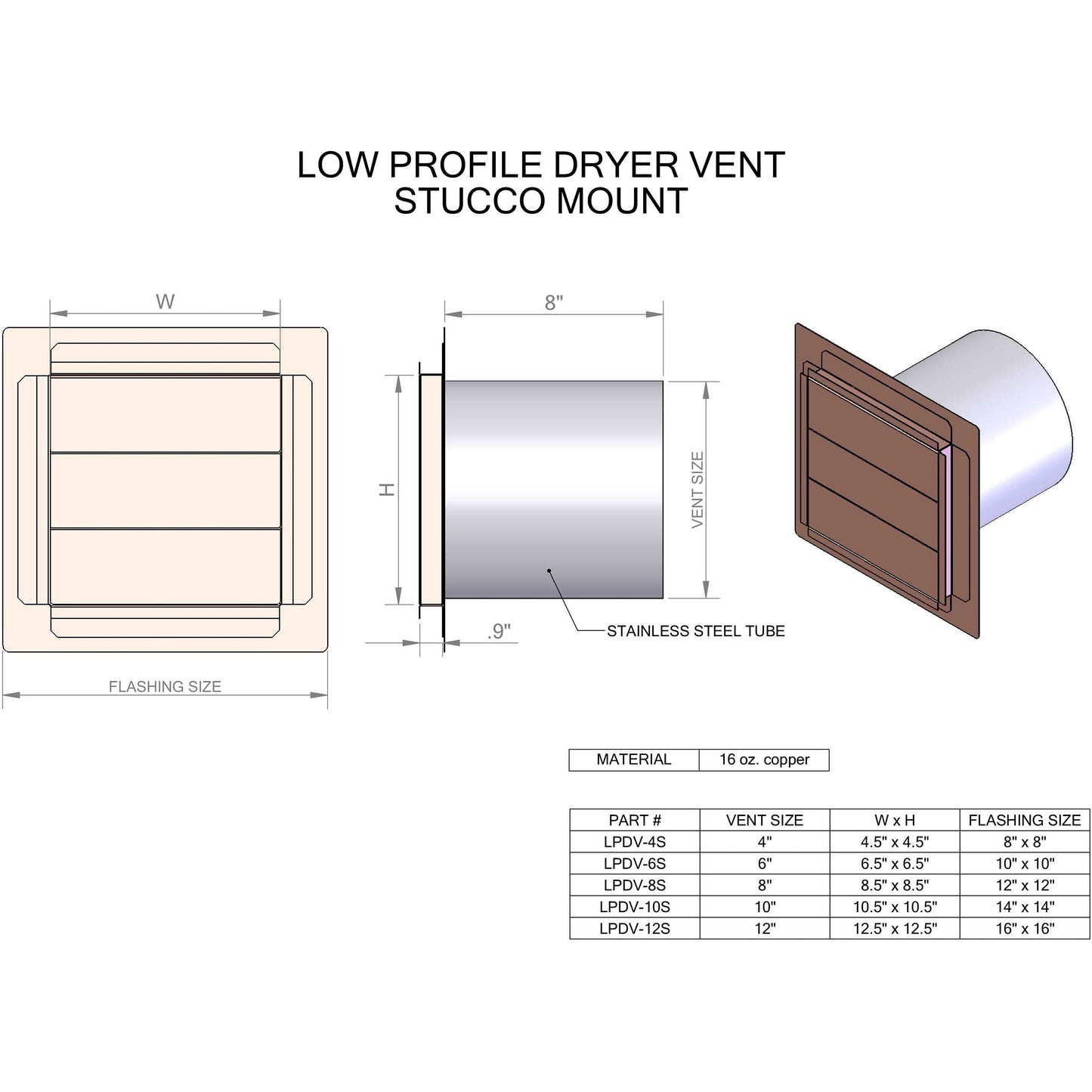 Expertly made from 16-ounce hammered copper, this louvered dryer vent comes in 4"-12" sizes and is suitable for venting clothes dryers, bathroom fans, and stoves. Its low profile design sits flush with building siding and has two different mounting styles available: flush mount for installations on pre-existing siding or brick/stone buildings, and stucco mount for installations prior to siding with water-proofing. Made with one way louvers, this vent effectively allows air out while keeping elements from getting in. The pipe extends 8" and is a standard option. Wondering which mounting style is best? Explore our guide to buying kitchen ventilation for more information.