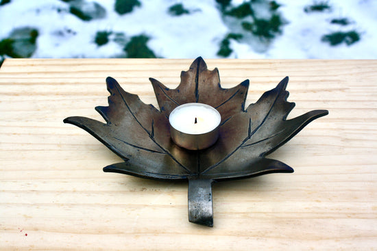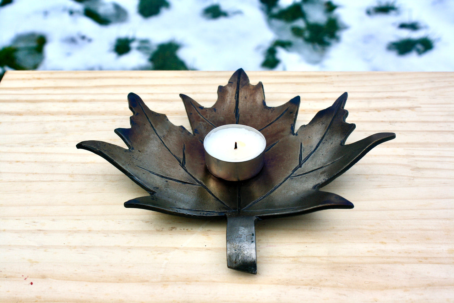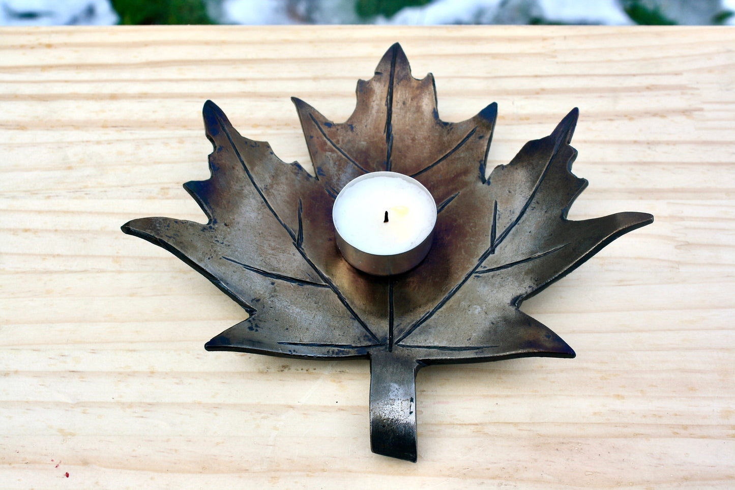 This unique maple leaf dish is carefully crafted using hand-forged steel, with each vein and shape meticulously shaped by hand using fire hammers. After polishing and flame coloring, a protective lacquer is applied to preserve the color and shine of the piece. While the dish is perfect for decorating, it should not be used for food. It also serves as a lovely candle or ring dish.