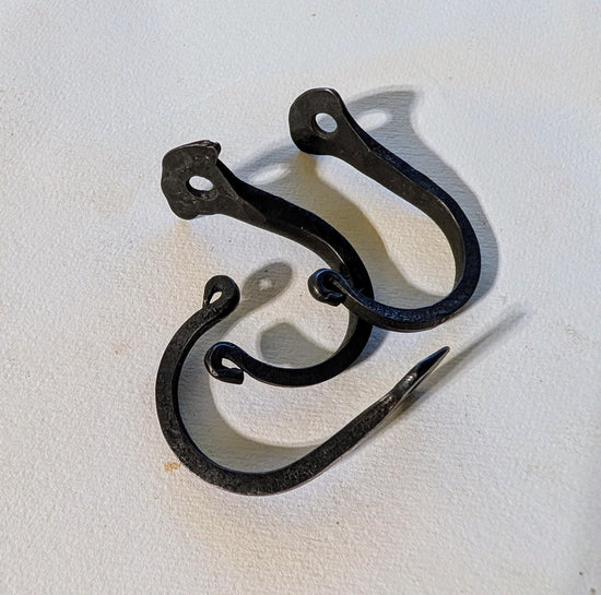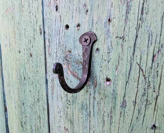 This hand-forged nail hook combines traditional blacksmithing with practical design. Crafted from old-fashioned cut nails and shaped by hand, it supports up to 40 pounds with a sturdy 1-inch inside diameter, suitable for hanging coats, tools, or decorative items. Choose between a beeswax finish for a natural, rustic look with light protection, or a polyurethane finish for a smooth, durable surface resistant to moisture and wear. Each hook is custom made upon order, requiring 4 weeks for delivery. Made from low-carbon steel, these hooks may develop rust over time but can be maintained by buffing and applying paste wax. For questions or custom requests, feel free to contact us.