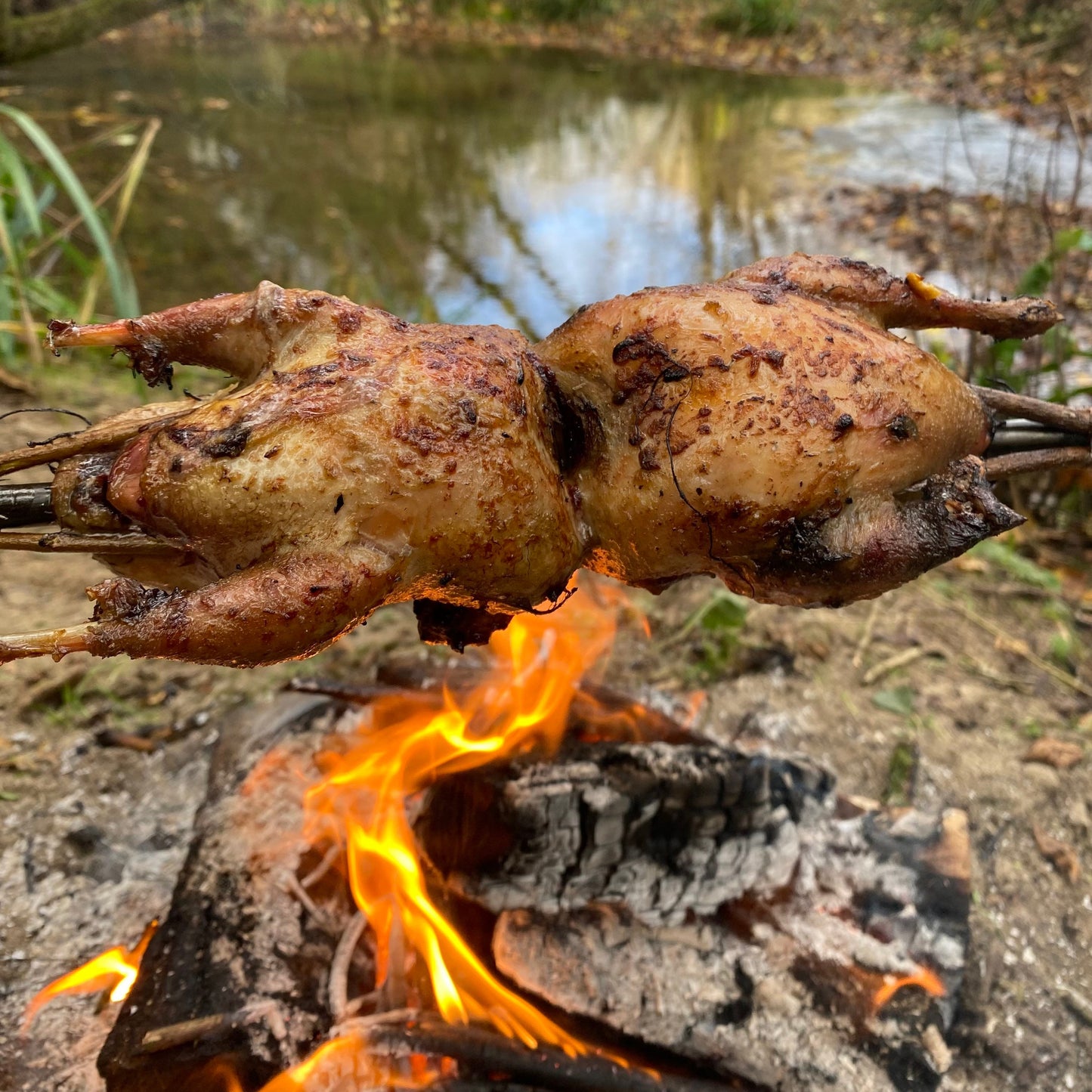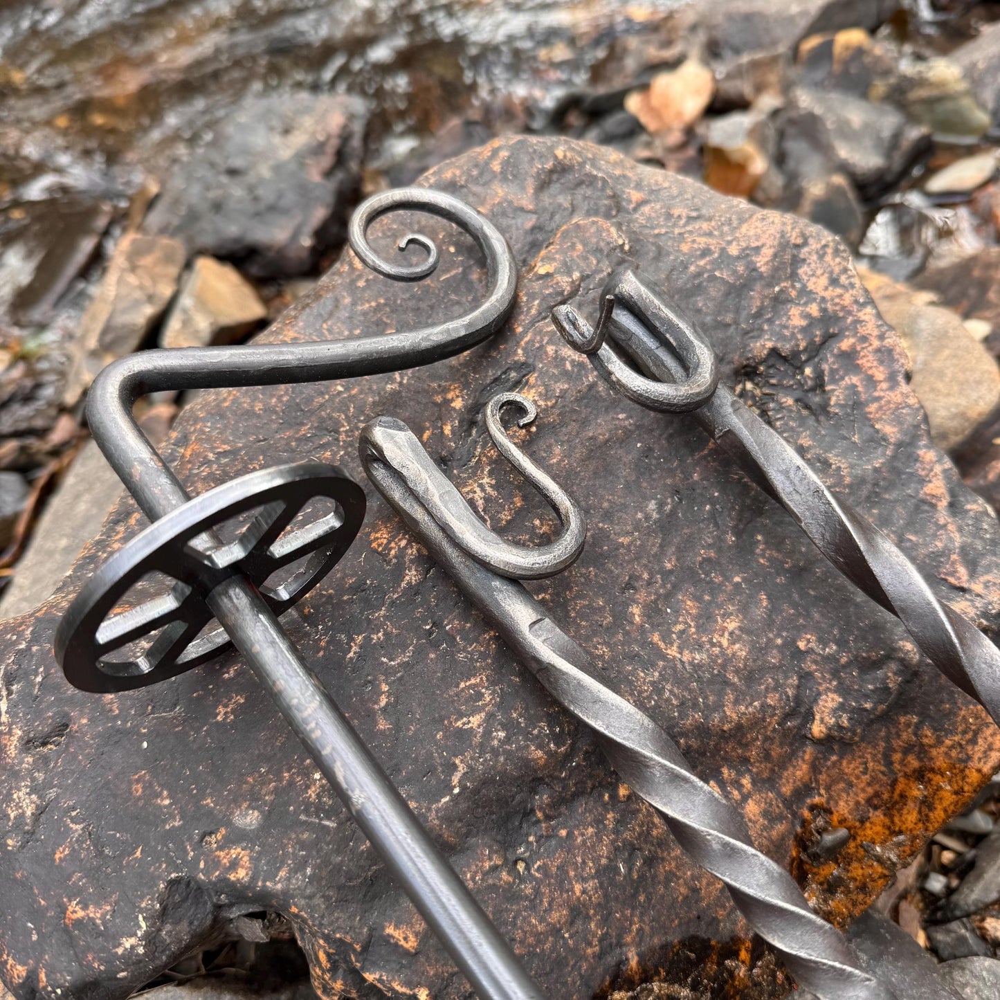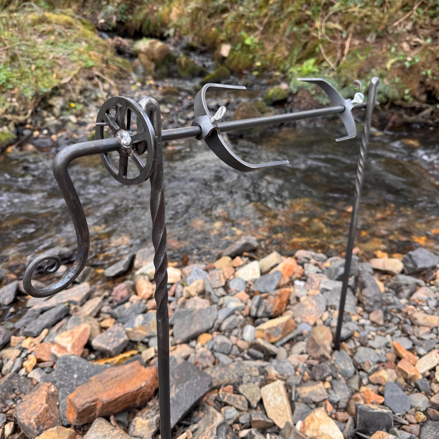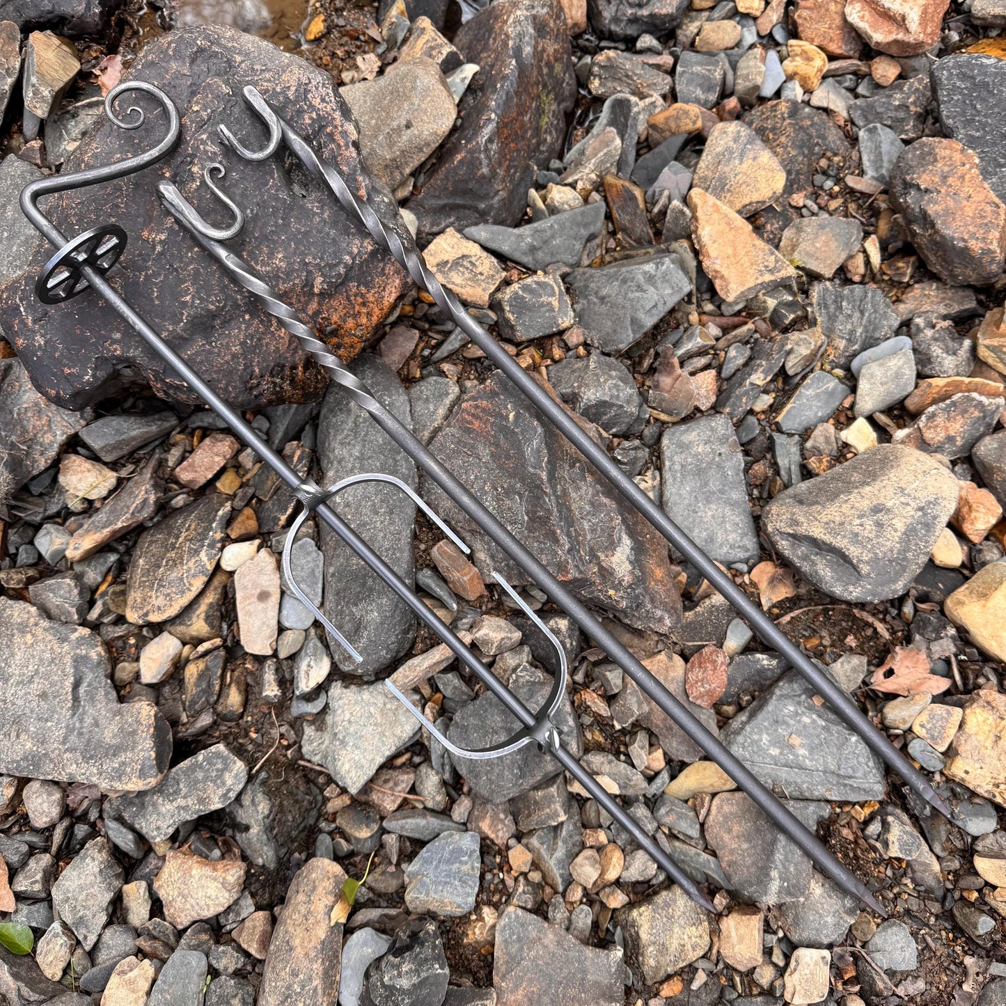 Crafted with precision and expertise, this manually forged camping spit allows for perfect rotisserie cooking next to a warm campfire. Simply spear and rotate your preferred food, and relax as it cooks to perfection in just 10 to 15 minutes. With a built-in locking mechanism, this upright and spit ensures even cooking and maximum convenience. This set includes two forged uprights, a spit, and two rotisserie forks, all compactly designed for easy transport. With uprights measuring 70cm and a 65cm spit, you can easily cook a variety of meals, from chicken and lamb to venison. Perfect for wilderness excursions, beach cookouts, or cozy backyard fire pits. Experience the traditional way of cooking over an open fire with this hand-forged rotisserie spit.