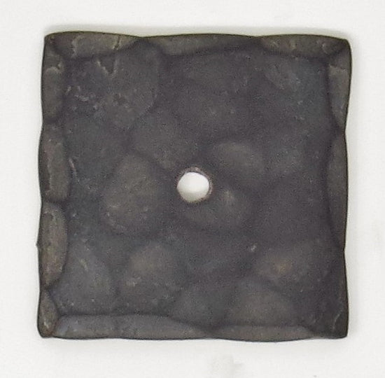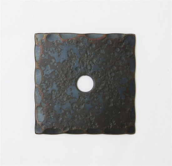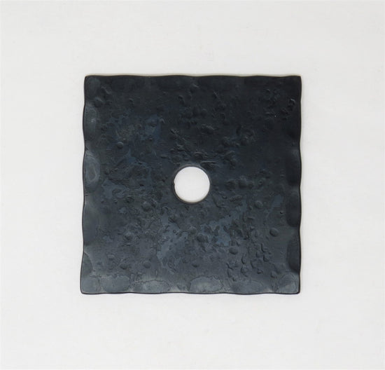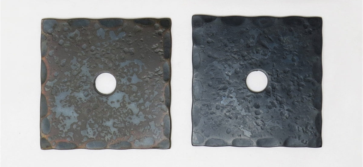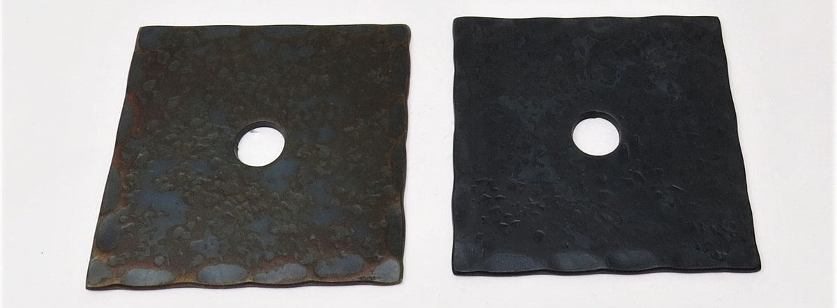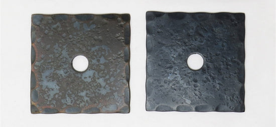 Square iron plate washer in extra large sizes and hammered options. These plate washers are a unique alternative to standard zinc or galvanized coated washers, they add a rustic and old world look to all projects. The first image shows gunmetal finish on all four washers. The second picture shows left to right, smooth texture with black finish Hammered edges texture with bronze finish, distressed texture with rust finish, all hammered texture with antique finish.