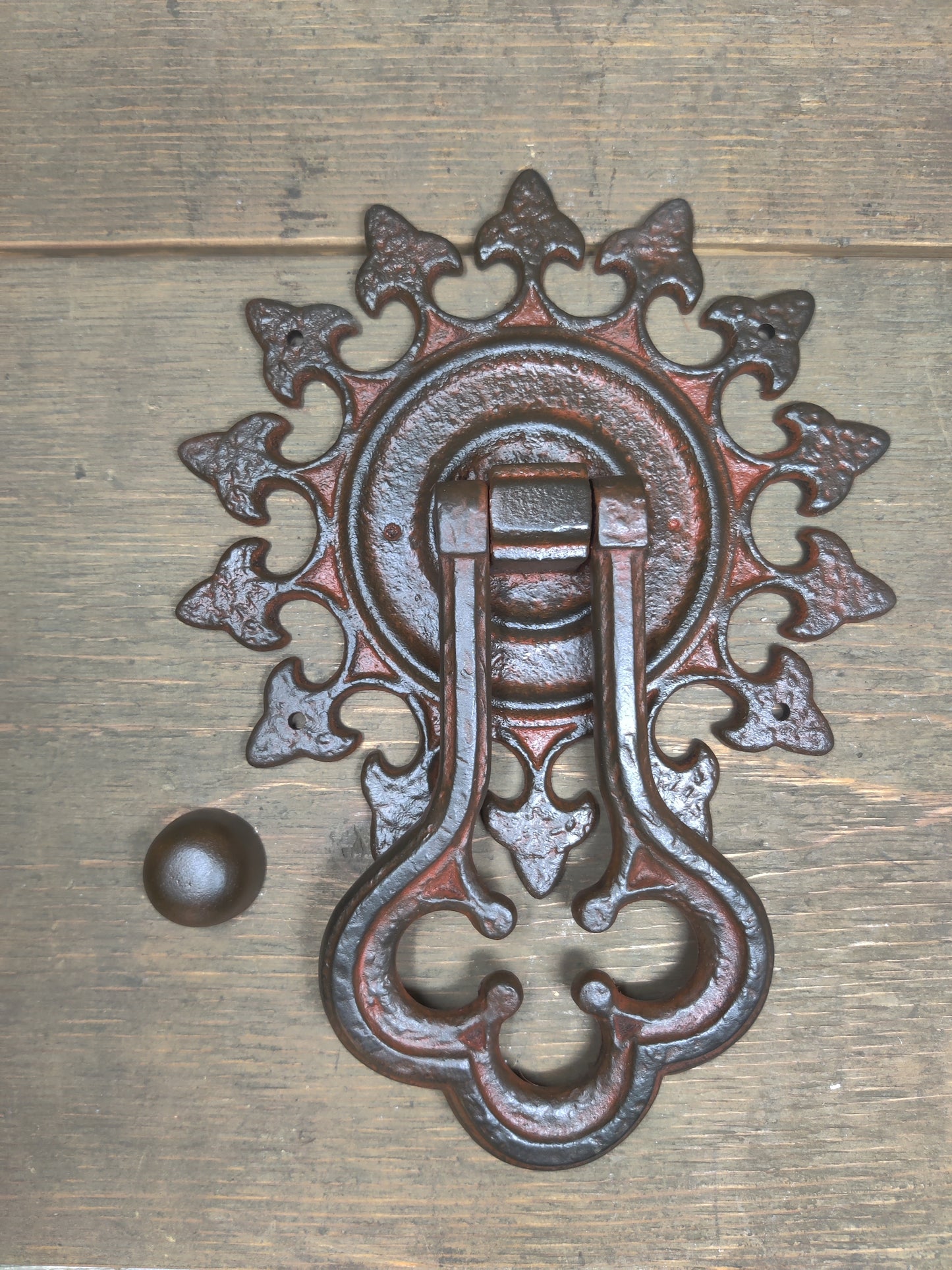Are you looking to elevate the look and value of your home? Look no further than this magnificent Portuguese Gothic iron door knocker. With elements such as horseshoe arches, cinquefoils, trefoils and muqarnas, this door knocker is full of exotic details that draw inspiration from far-reaching historical sources beyond the typical classical and Gothic styles. Combining both Persian, Spanish, Indian, Moroccan, Medieval and Mediterranean elements into one design, you can be sure that this knocker will make your doorway stand out from the rest. It's no wonder why this style has become so popular among homeowners after mid-19th century – it brings together distinguished designs from all around the world to make a unique statement that's guaranteed to leave a lasting impression. Upgrade your home today with this exquisite Portuguese Gothic iron door knocker.
