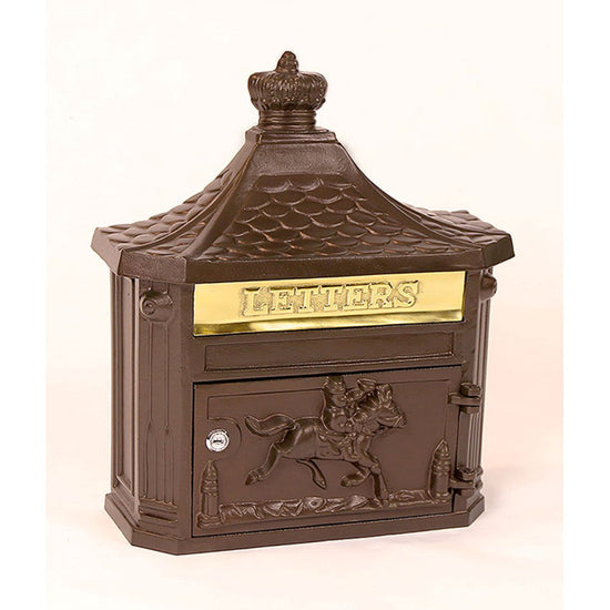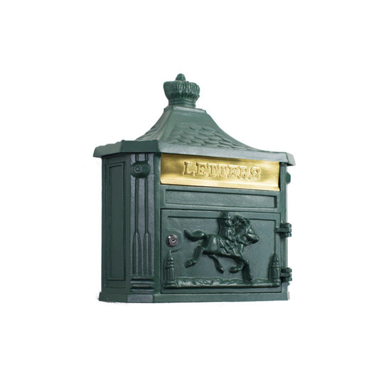 This mailbox provides a refined and secure solution for mail storage, blending classic design with robust construction. Crafted with attention to detail, it ensures long-lasting durability and strength. The Victorian style, featuring a historic pony express motif, is available in a wall-mounted version. It includes a front door with a secure lock and a solid brass mail flap that opens according to mail volume. Each unit comes with four keys for added security. Please note, mounting hardware is sold separately.
